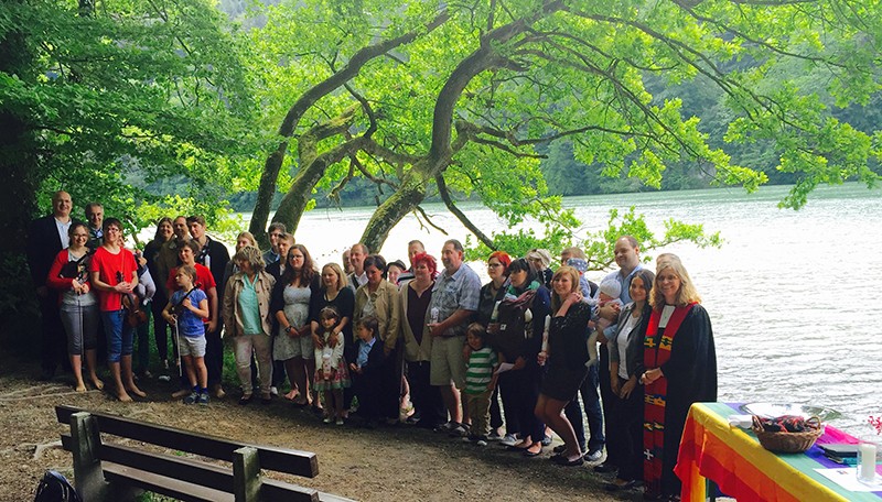 Der Pfingstgottesdienst im Grünen mit Taufen am Rhein, der wieder zusammen mit der Evangelischen Nachbargemeinde Kadelburg gefeiert wurde, fand in diesem Jahr am Pfingstsonntag, den 24.05.2015 um 11.30 Uhr erstmals oberhalb von Hohentengen /Herdern statt. Wegen des hohen Wasserstands kam die Stelle beim Roten Indianer in der Nähe des Campingplatzes in Herdern nicht in Frage.Deshalb versammelten sich die zahlreich erschienenen Gemeindeglieder und dieTauffamilien am Pfingstsonntag, den 24.05.2015 um 11.30 Uhr am Laufenloh, am Rhein oberhalb des Kraftwerks bei Hohentengen-Herdern gelegen.Luftballonswiesen den Weg. Getauft wurden fünf Kinder und eine Jugendliche: Luisa Busmann,Lea Guhl, Niklas Keil, Saskia Neisser, Sasha Lara Neumann und Emil Buchmann. In der Predigt ging Pfarrerin Andrea Kaiser auf den Psalm 23 ein, der anschließend mit Naturmaterialien von Kindern und Erwachsenen als Bodenbild gelegt wurde.Die musikalische Gestaltung des Gottesdienstes übernahmen Gabriel, Gloria und Salome Kaiser (Violine), Balthasar Kaiser (Cachon), Thomas O. H. Kaiser (Gitarre) und Winfried Handke (Akkordeon).