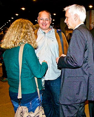 Am Randedes Besuchs des badischen Landesbischofs Prof. Dr. Jochen Cornelius-Bundschuhin der Waldshuter Versöhnungskirche am 18. November 2015 kam es auch zu einem Gespräch des Bischofs mit Pfarrerin Andrea Kaiser und Pfarrer Dr. Kaiser.(Foto: Sabine Gems-Thoma)
