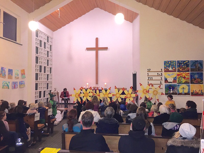 Der Familiengottesdienst am 6. Dezember 2015 um 11. 30 Uhr stand ganz im Zeichen von Advent und Weihnachten: Zur Aufführung gebracht wurde von 11 Kindern unter der Leitung von Catrin Werne aus Kadelburg das Theaterstück `Hatschi, das kleine Weihnachts-kamel´. Die zahlreich erschienenen Gottesdienstbesucher honorierten die gekonnte Darbietung der jungen Schauspielerinnen und Schauspieler, die geschminkt als Tiere verkleidet spielten und aktuelle Bezüge der Weihnachtsgeschichte zu heute herstellten, mit großem, herzlichen Applaus! Für die musikalische Gestaltung des Gottesdienstes sorgten Balthasar Kaiser (Violine) und Pfarrer Dr. Kaiser (Gitarre). Da Nikolaustag war, durfte natürlich das bekannte Lied `Bald ist Nikolausabend da´ nicht fehlen! Zum Schluss erhielten alle Mitwirkenden von Kirchengemeinderatsvorsitzender Brigitte Rogge ein kleines Präsent als Dankeschön und alle jüngeren Kinder durften sich mit Schoko-Kugeln eindecken. Beim Kirchenkaffee im Anschluss an den Gottesdienst ergab sich noch das ein- oder andere Gespräch.
